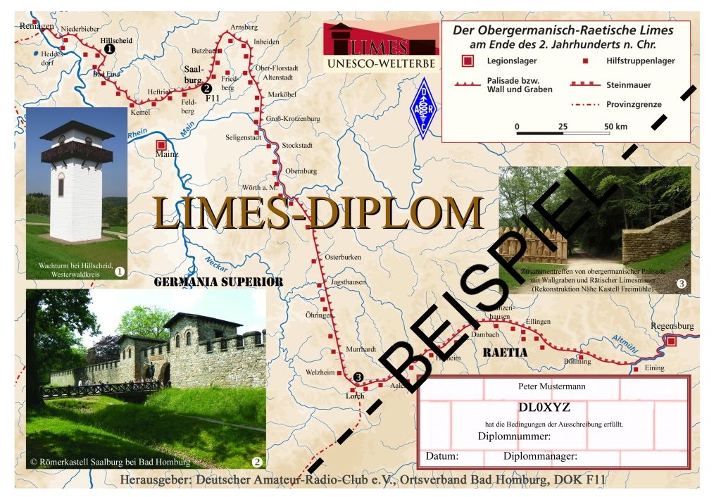 The Limes Award is issued by the local branch F11 located in Bad Homburg of the German Amateur Radio Club (DARC e.V.). It has been recognized as official by the DARC on June 15th, 2010. Applicants may be licensed Amateurs or SWLs. All contacts must be made on or after January 1st, 2010. Each band and mode except packet radio is allowed. Only contacts with stations located at the historical Roman Limes are valid. To achive the Basic Award and the Gladius Award the applicants must fullfill the requirements regarding the number of points, the number of DOK and the number of districts worked.